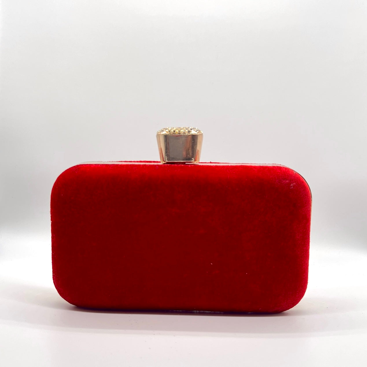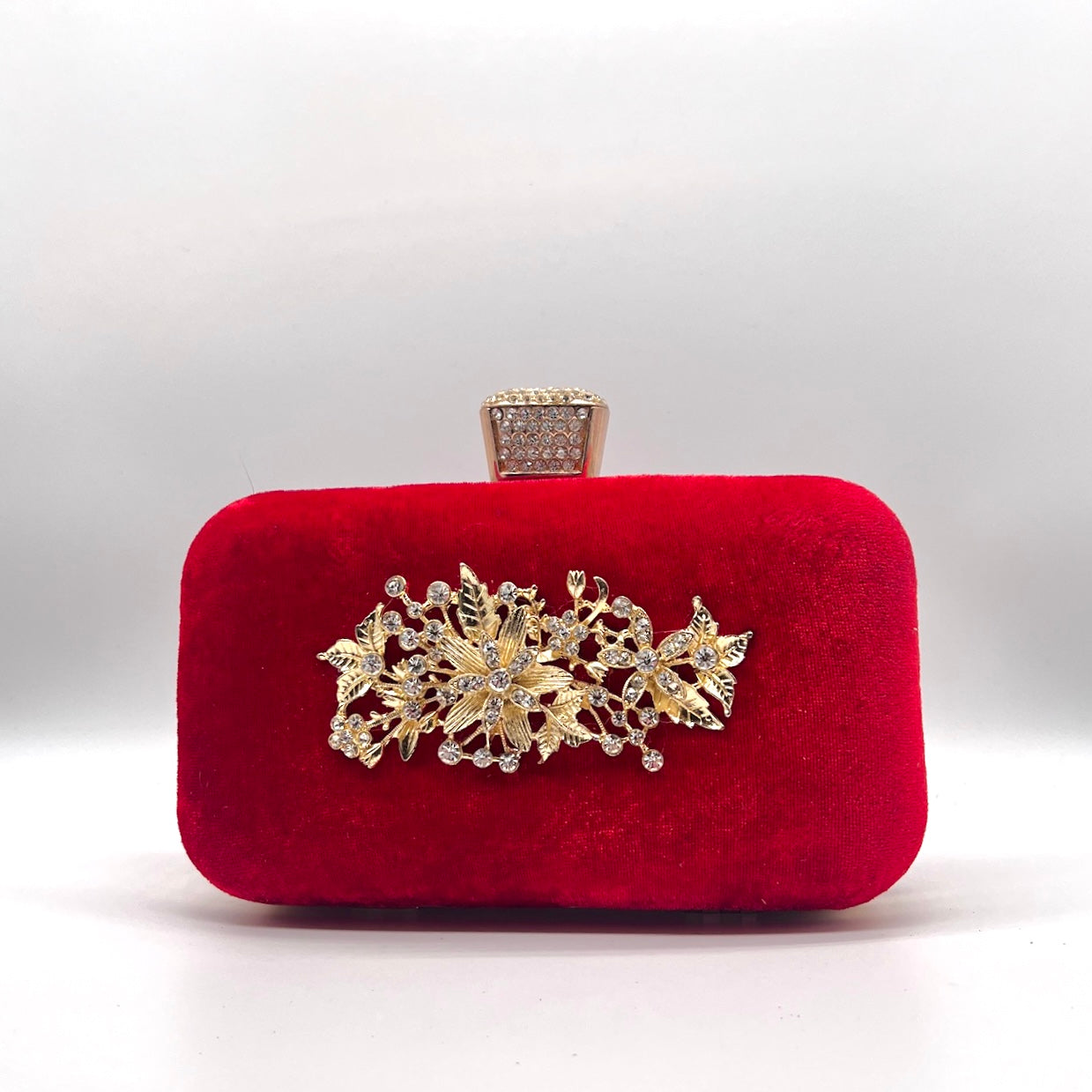 Mirelle, A velvet frame box clutch adorned with a delicate brooch, set against a sleek metal frame. This luxurious clutch will add a touch of glamour to any outfit.