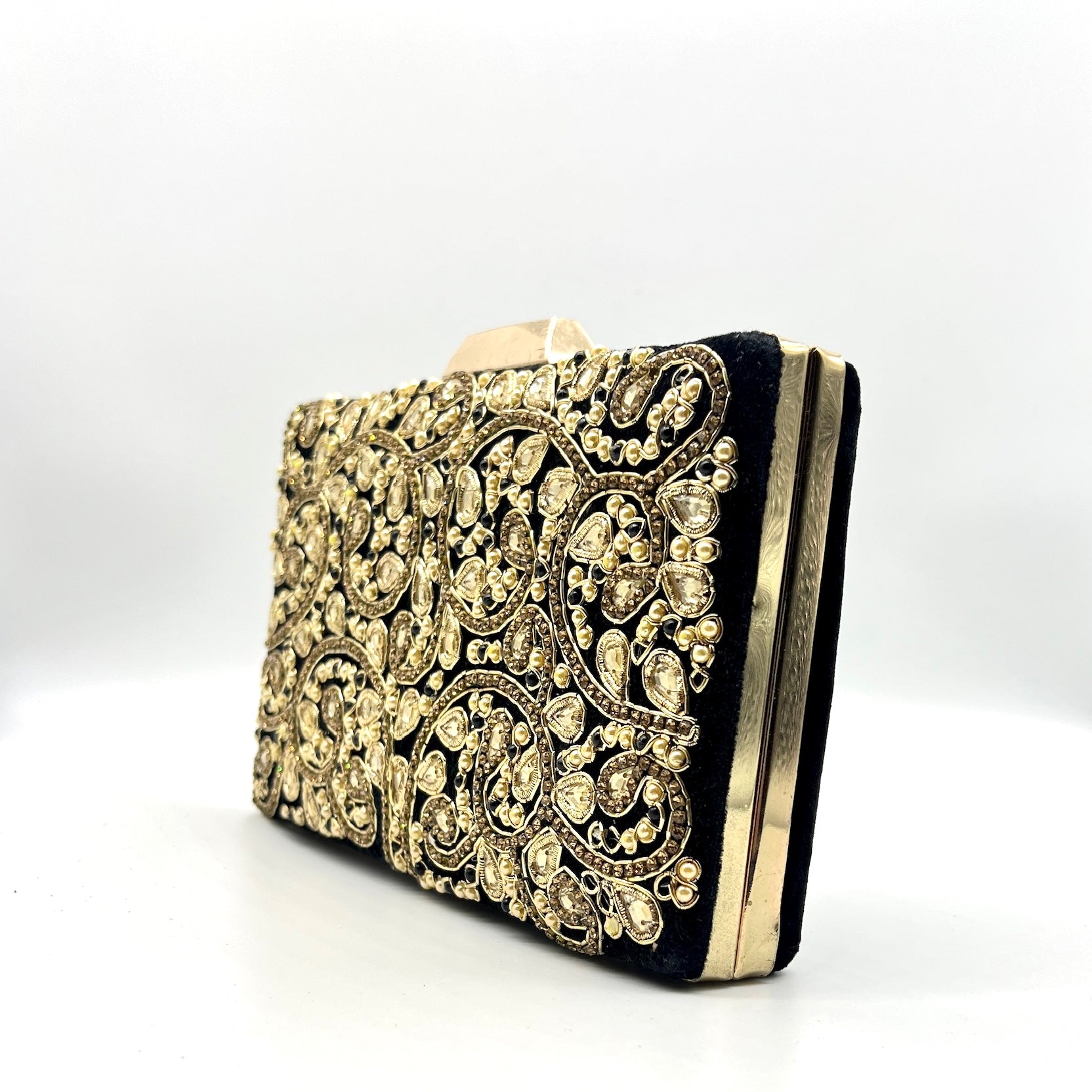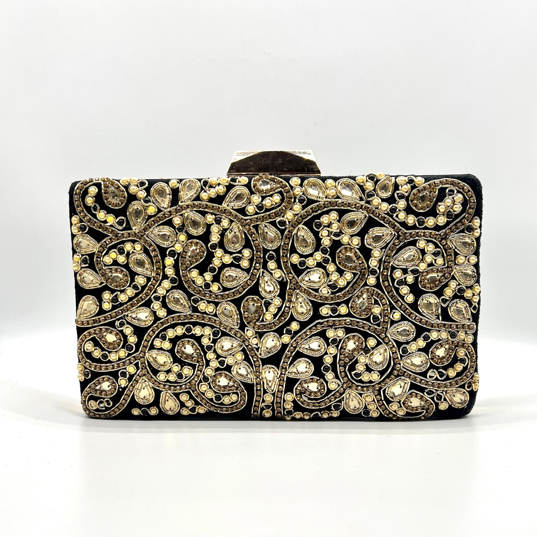 Introducing Lunara, This metal frame clutch boasts a velvet exterior, adorned with handcrafted intricate work of beads and stones. Elegant and exclusive, Lunara will elevate any ensemble and make you stand out in any crowd.