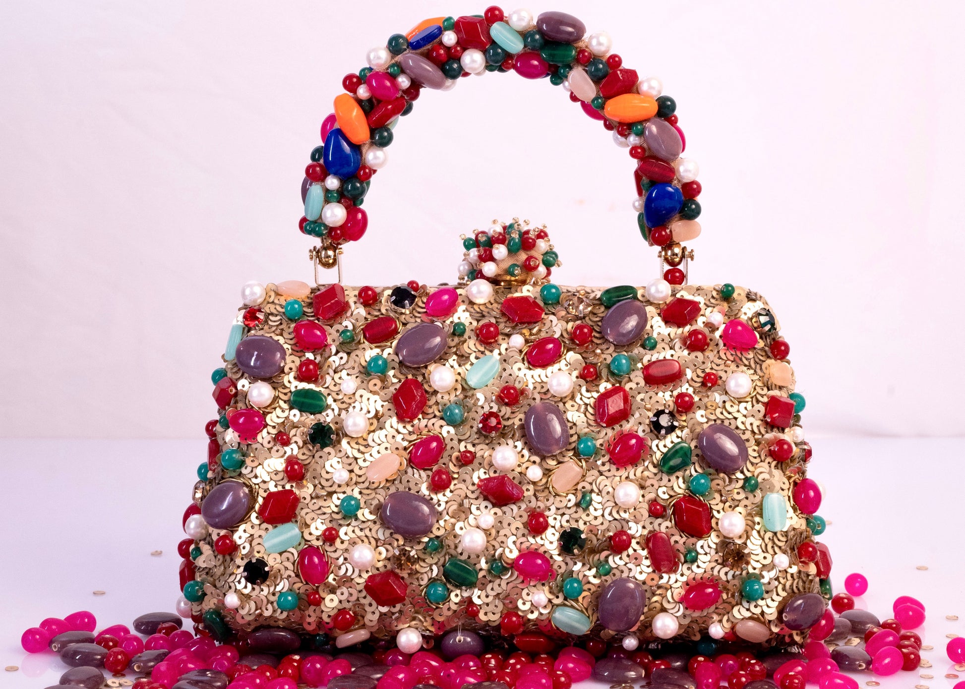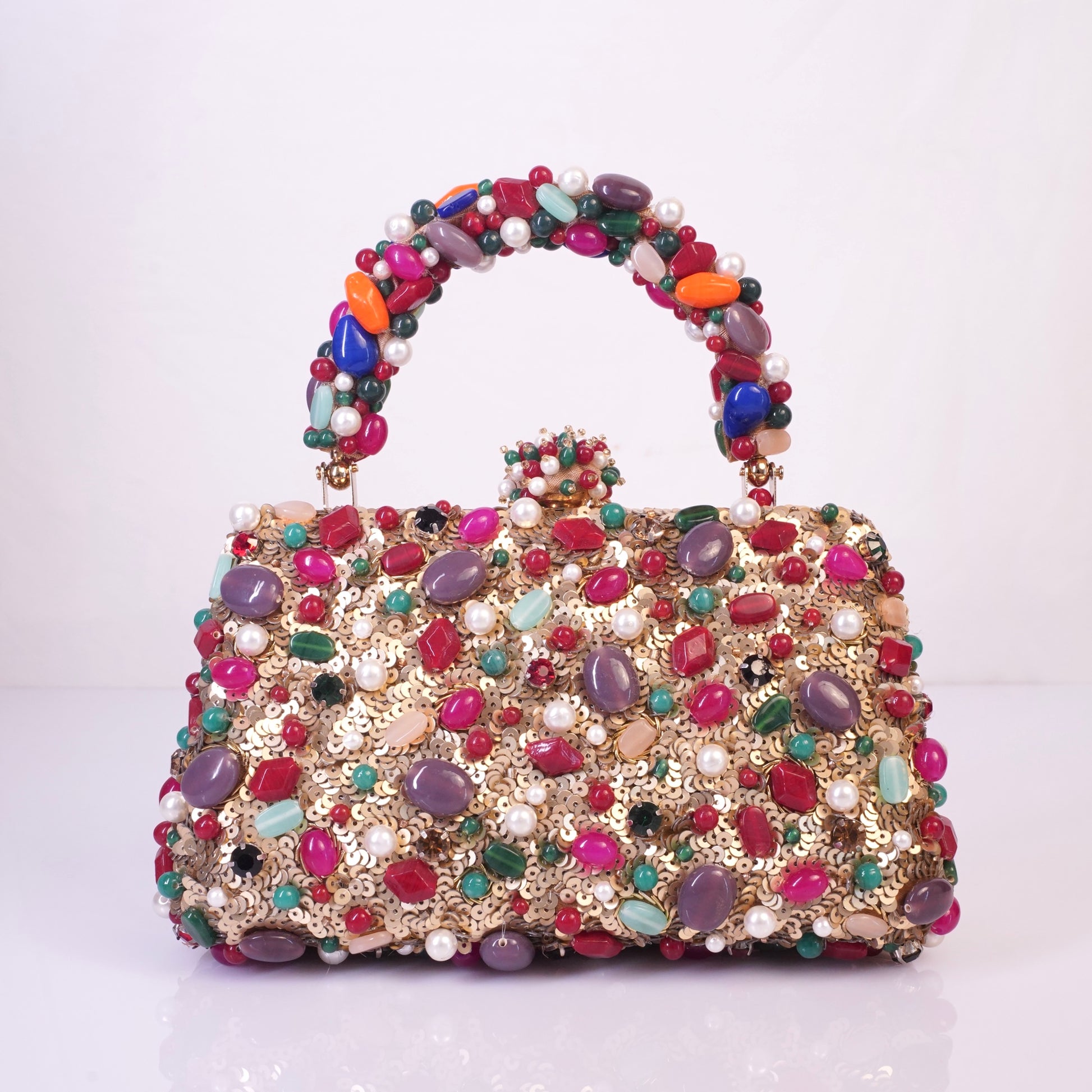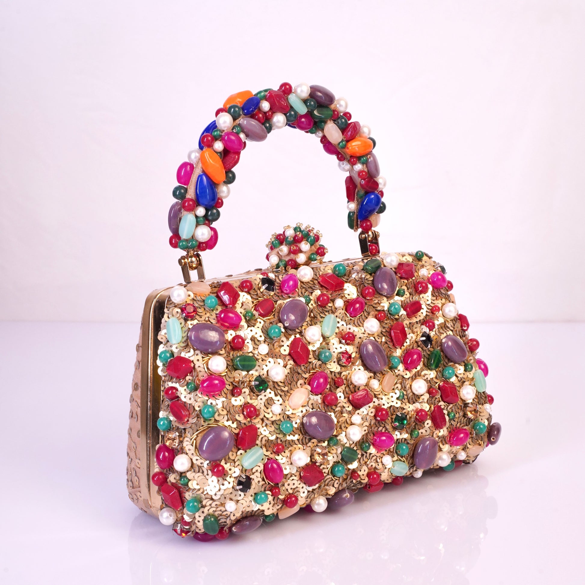 Indulge in the opulence of Juvia, a lavish designer handbag embellished with elaborate stone and zari detailing. Meticulous artistry converges with exquisite aesthetics, as Juvia features a handle crafted entirely of stones for a flawless finish.
