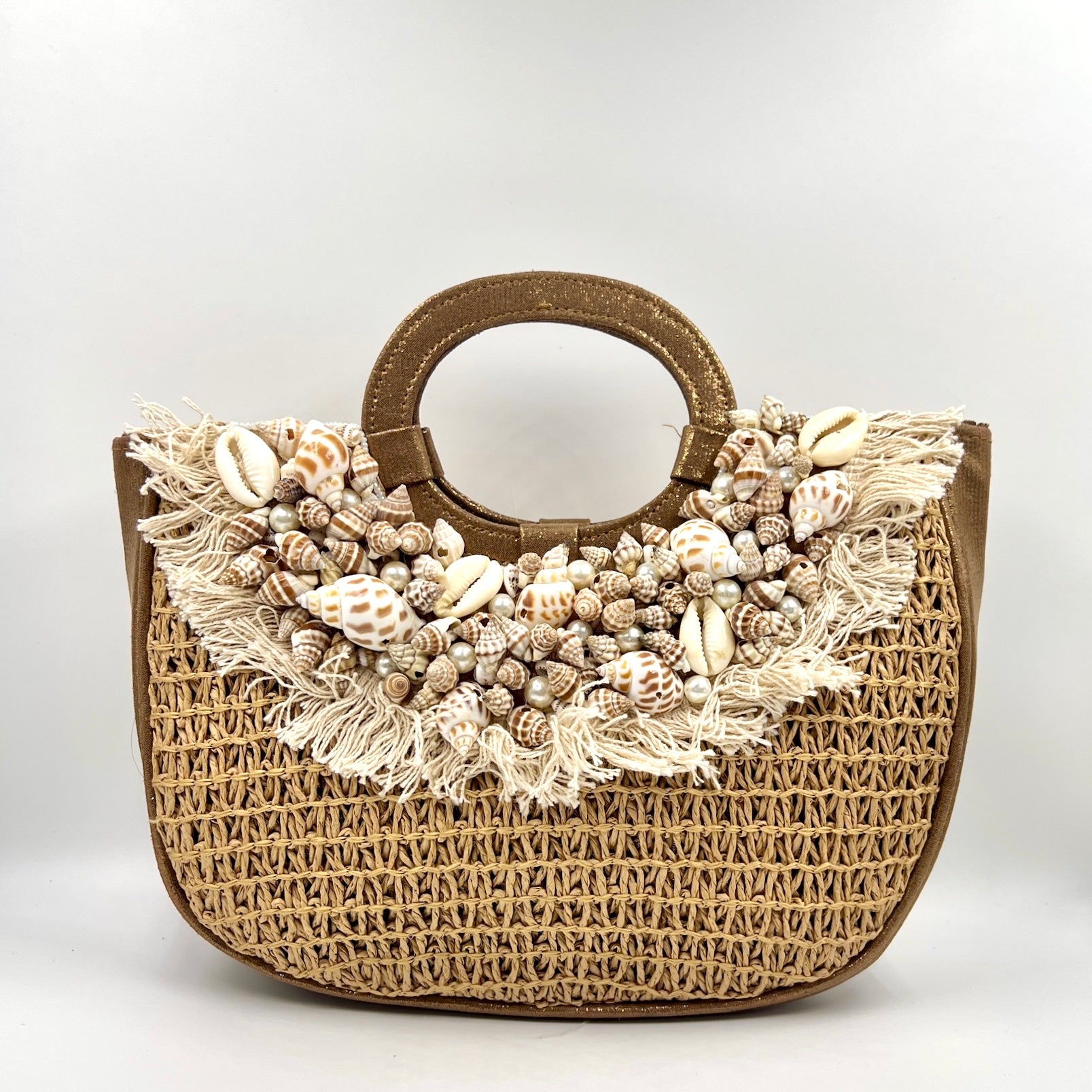 Embrace the ocean with Sira, the handbag featuring jute-like material. Adorned with delicate seashells, this luxurious accessory is the perfect blend of nature and high fashion. Carry it with sophistication and elevate your style to new heights.