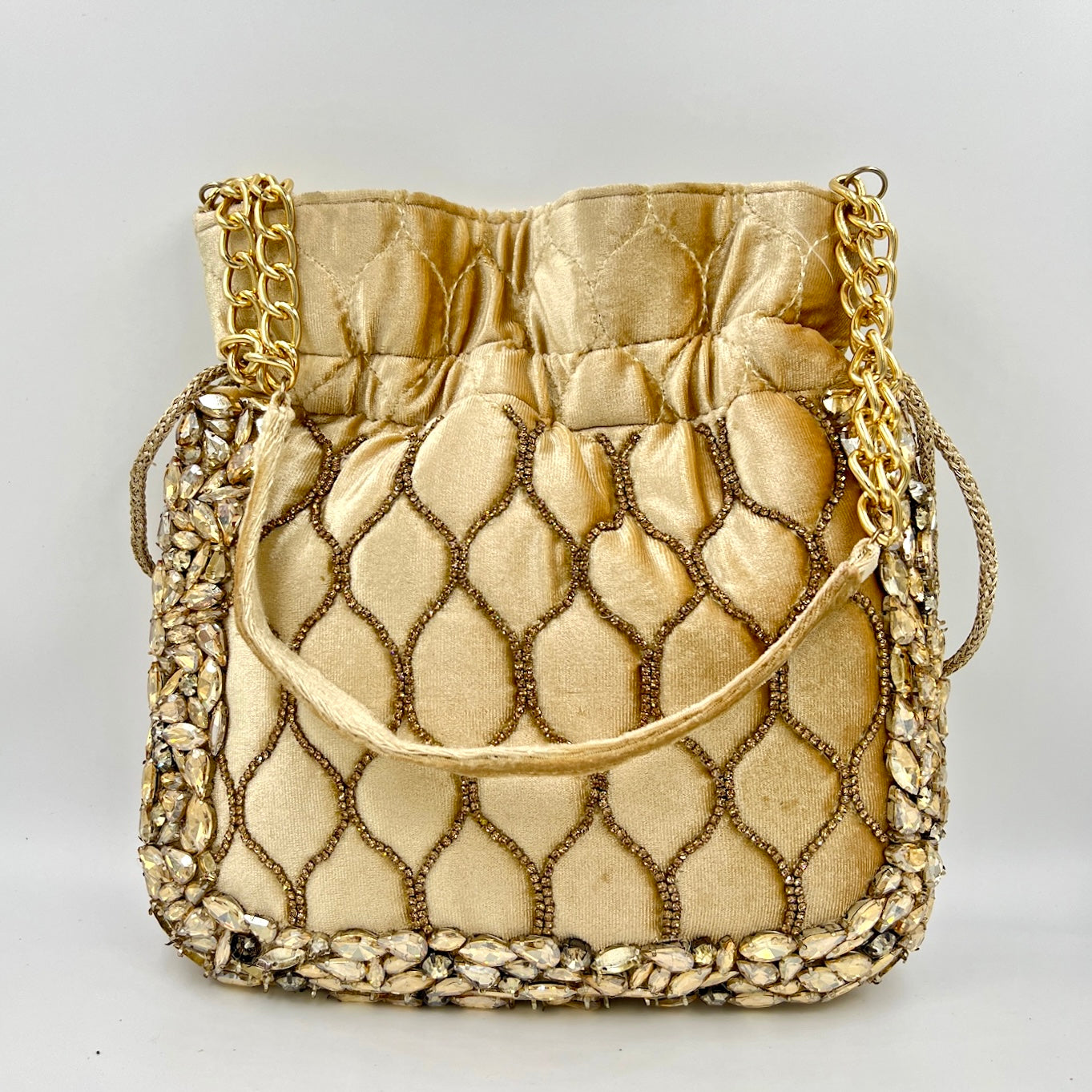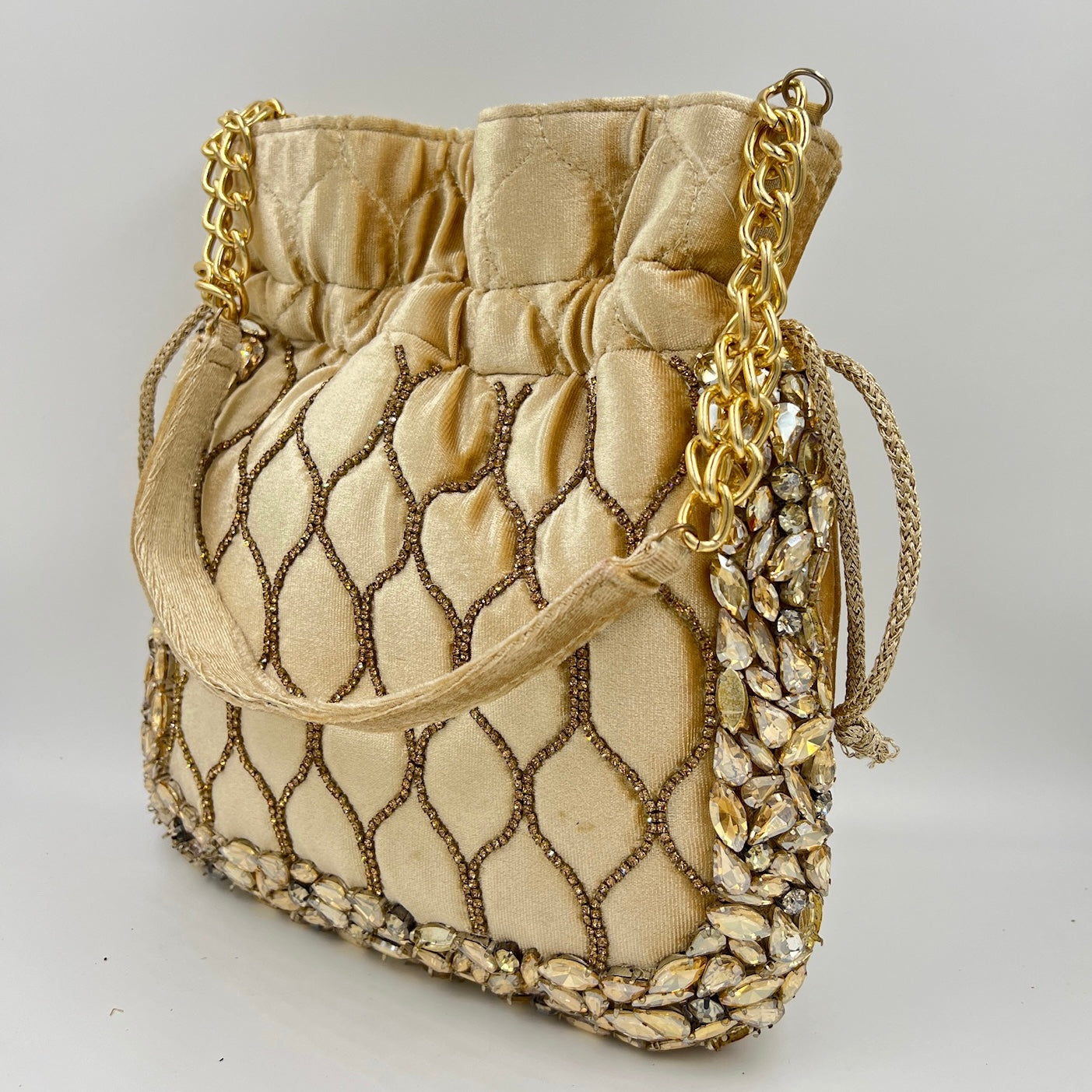 Introducing Potlika, This intricately designed potli bag is adorned with exquisite stones, housing ideal space for your daily essentials and more whilst adding a touch of opulence to any outfit.