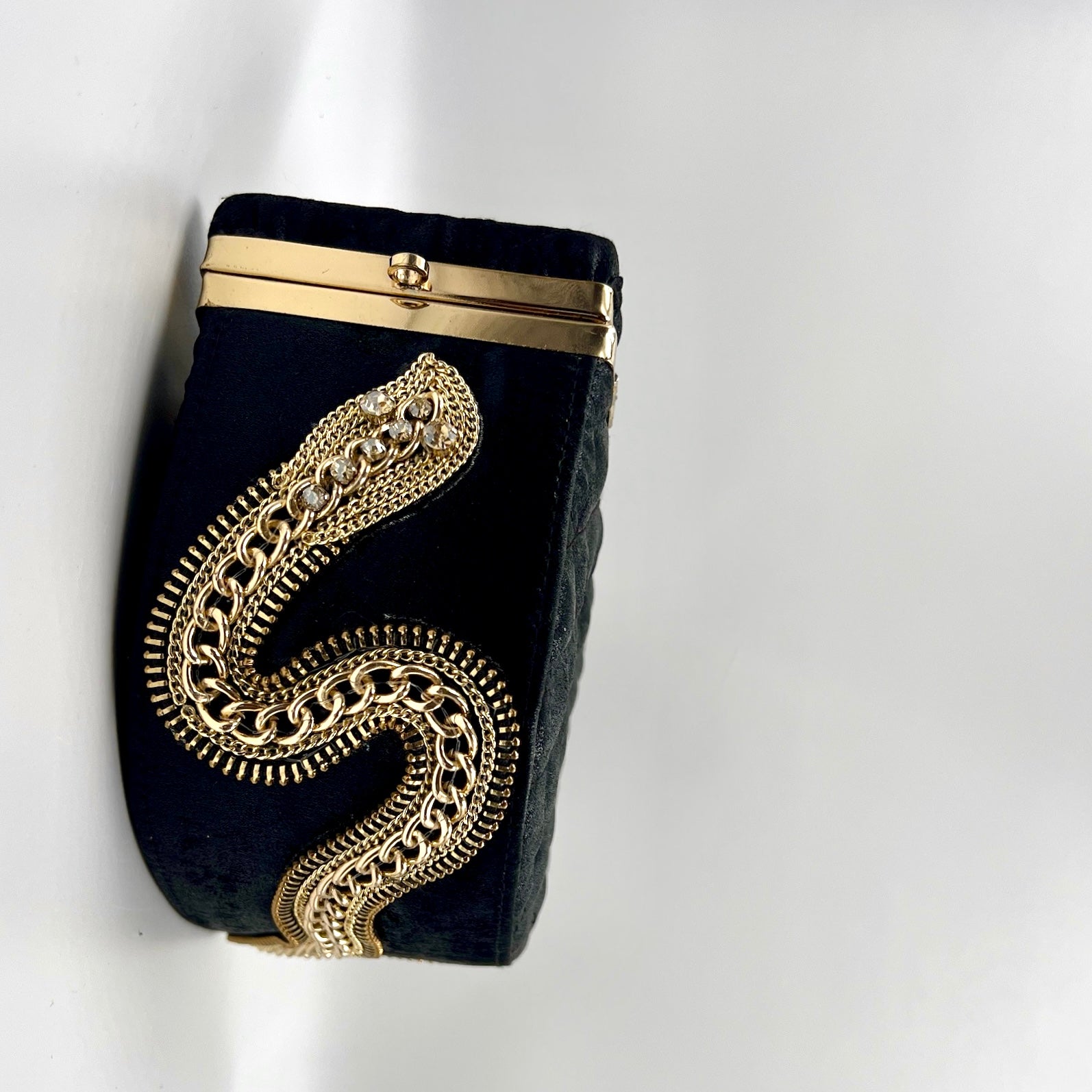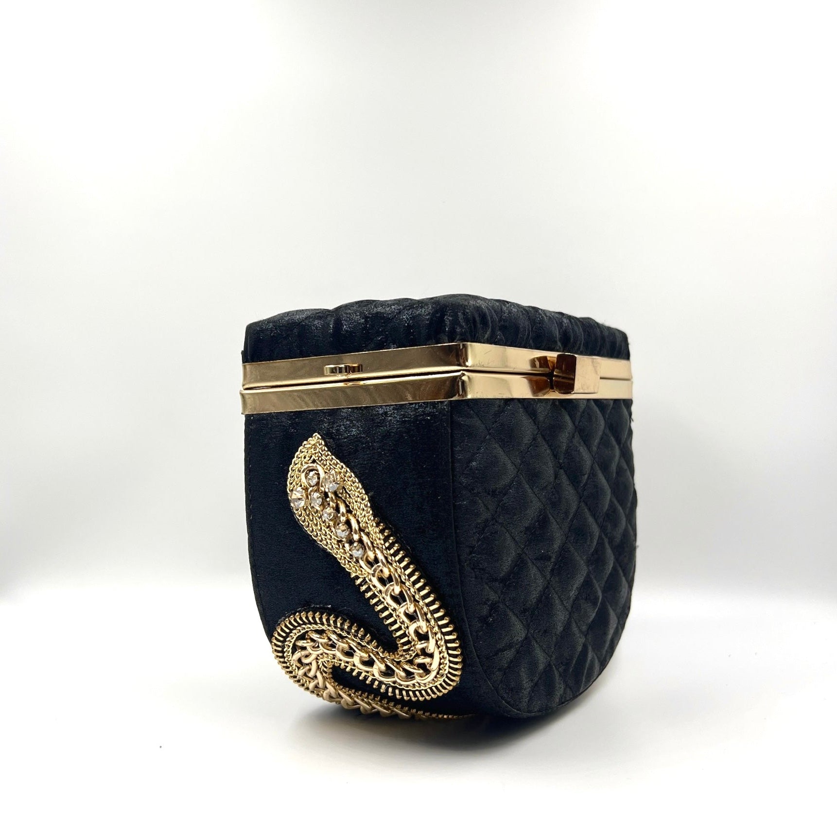 Ophia, This potli bag features a serpent made of interlocking chains, creating an exclusive look. The bottom is adorned with intricate and inspired craftsmanship, elevating your style to the next level.