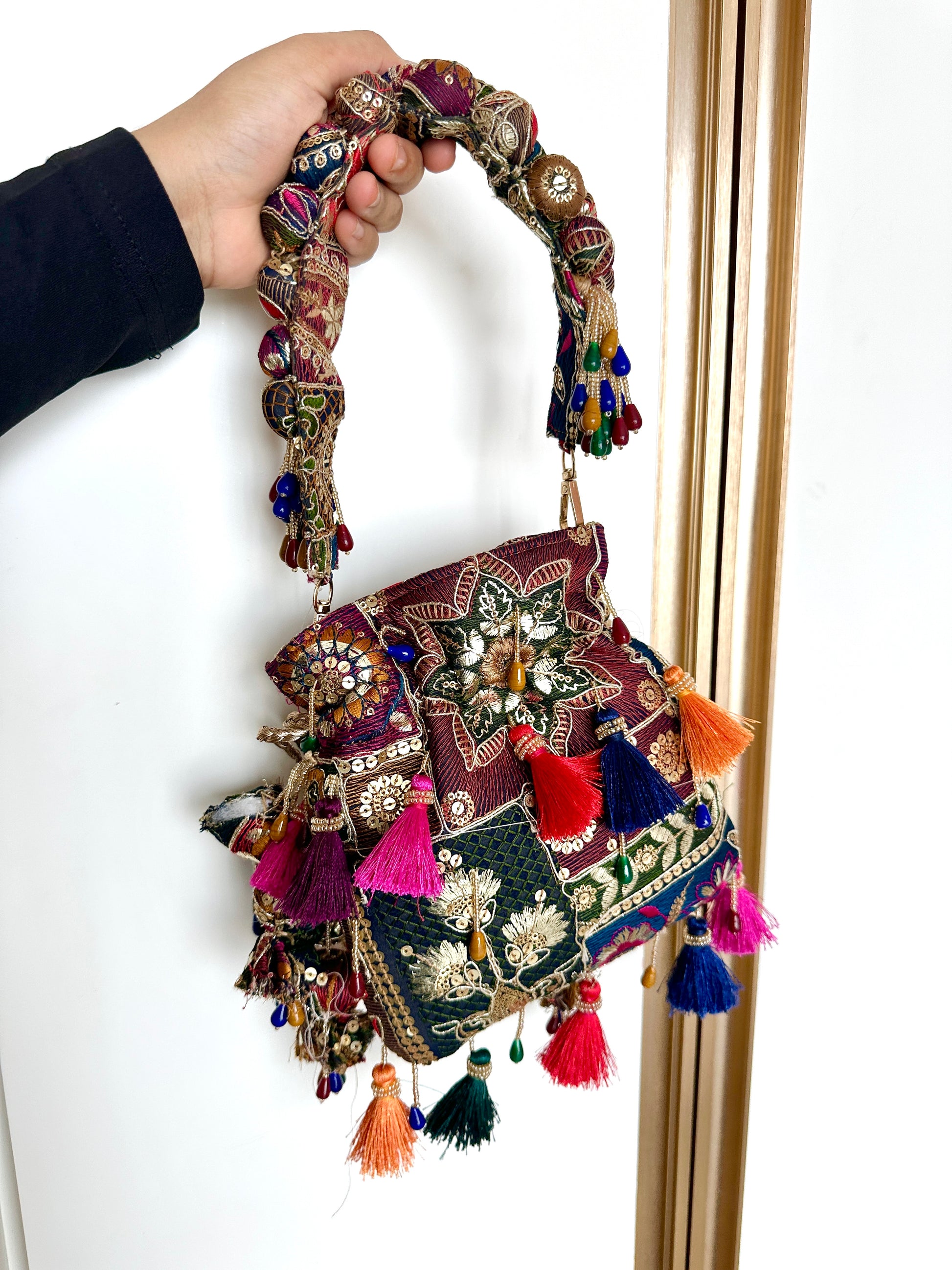 Leher, a potli bag featuring intricate hand-stitched zari cloth and playful latkans. Artfully crafted with the finest materials.